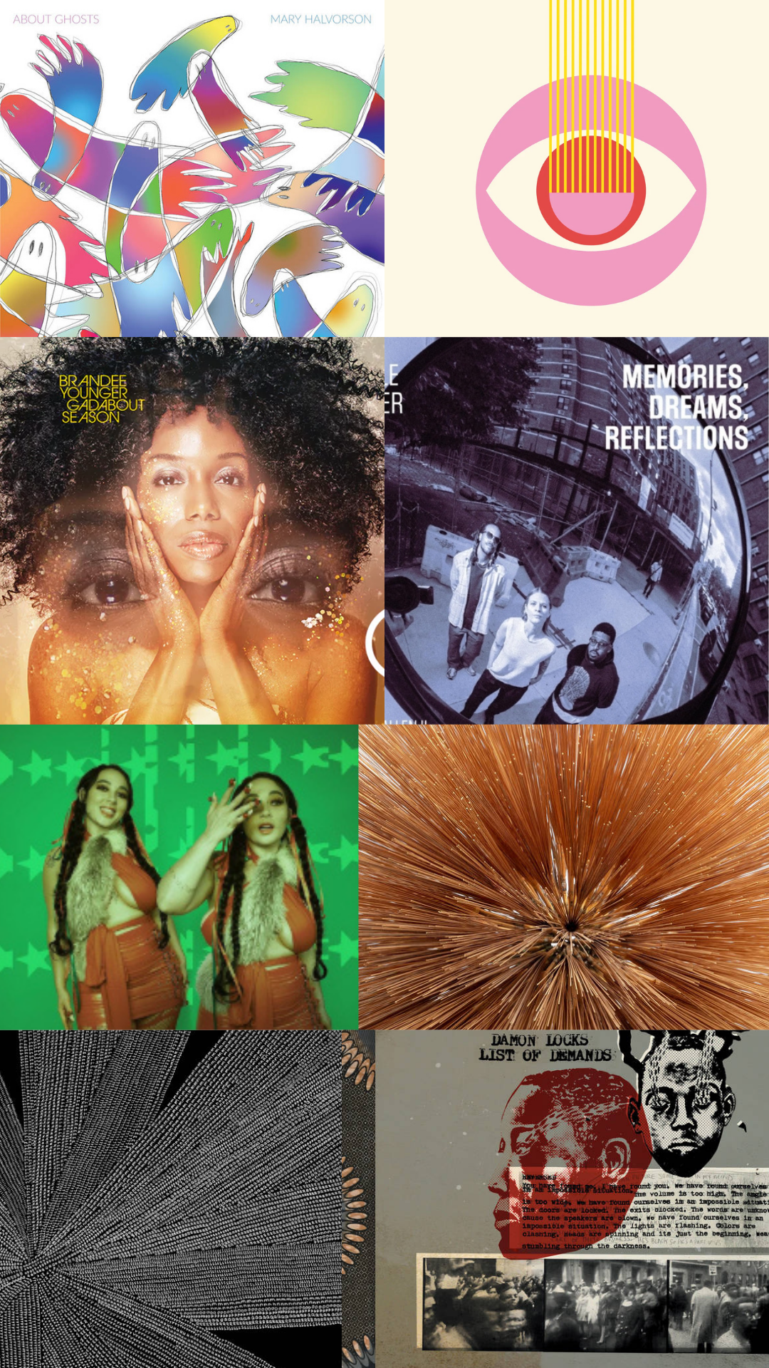 So much great material this year. The Spaces designation starts as mostly jazz, classical, and electronic, but I think of it as anything more sculptural, environmental, or exploratory. Obviously, there’s a lot of overlap – Antibalas, Damon Locks, William Tyler/Kieran Hebden’s Lyle Lovett cover, Moor Mother’s orchestral reworking of an earlier song, for example – would have definitely worked in the other list, but this was a by-feel process. These songs all felt right with the other songs on this playlist.
